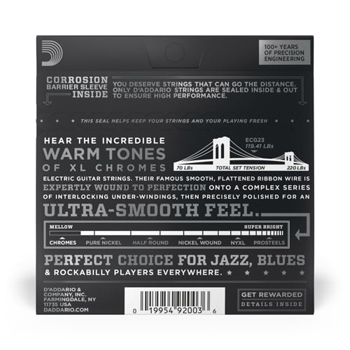 – Like all D’Addario electric guitar strings, XL Chromes are made with our proprietary Hex-Core, ensuring perfect intonation, consistent feel, and reliable durability.