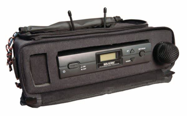 • Holds lavalieres, cables, and wireless mic with receiver mounted