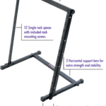 Keep rack gear safe and organized with our sturdy RS7030 Tabletop Rack Stand. The 12-space rack firmly supports rack-mount components and angles equipment toward the user to facilitate viewing and adjusting settings. Included rack screws securely fasten gear to the stand. Nonslip rubber feet increase stability and reduce vibration.