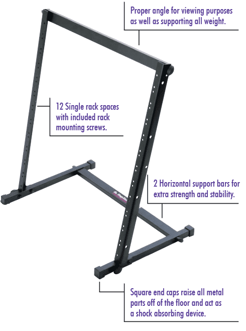 Keep rack gear safe and organized with our sturdy RS7030 Tabletop Rack Stand. The 12-space rack firmly supports rack-mount components and angles equipment toward the user to facilitate viewing and adjusting settings. Included rack screws securely fasten gear to the stand. Nonslip rubber feet increase stability and reduce vibration.