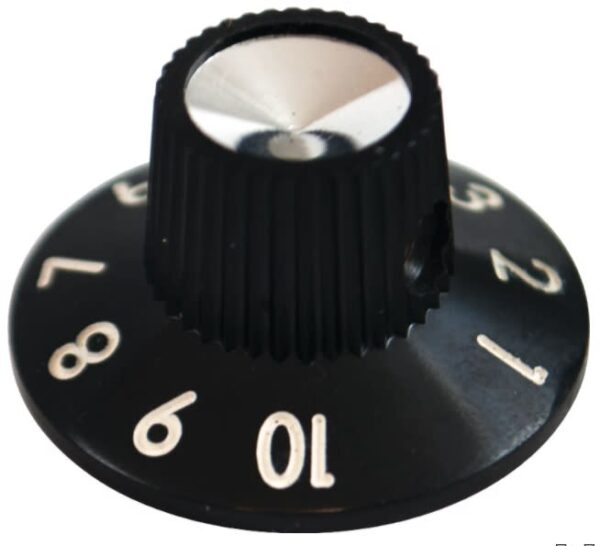 Black knob with white line, silver top, set screw and brass insert. Fits ¼” shaft with set screw